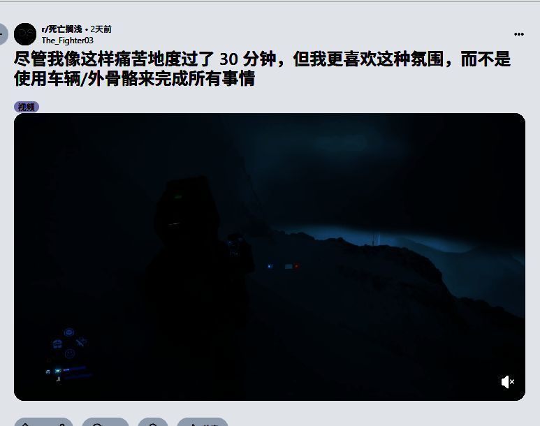 《死亡搁浅2》被部分玩家和评论者认为因多种升级和便利系统而降低了游戏难度。例如,单轨列车可以高效运输大量货物,机械外骨骼和车辆升级能显著提升地形适应能力,而游戏中的“棺材滑板”更能轻松应对各种路况。然而,这位玩家选择放弃这些辅助设施,完全靠双腿在崎岖地形上缓慢行进。视频中中显示,角色在陡峭的山坡上移动缓慢且不稳,与使用机械外骨骼时的表现形成鲜明对比。