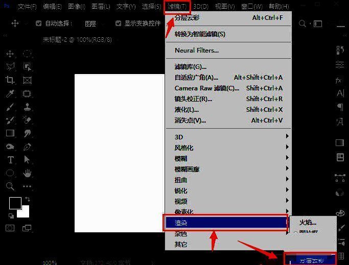 1.首先,打开PS后,新建一个白色画布,点击上方滤镜菜单中的渲染按钮,找到分层云彩选项