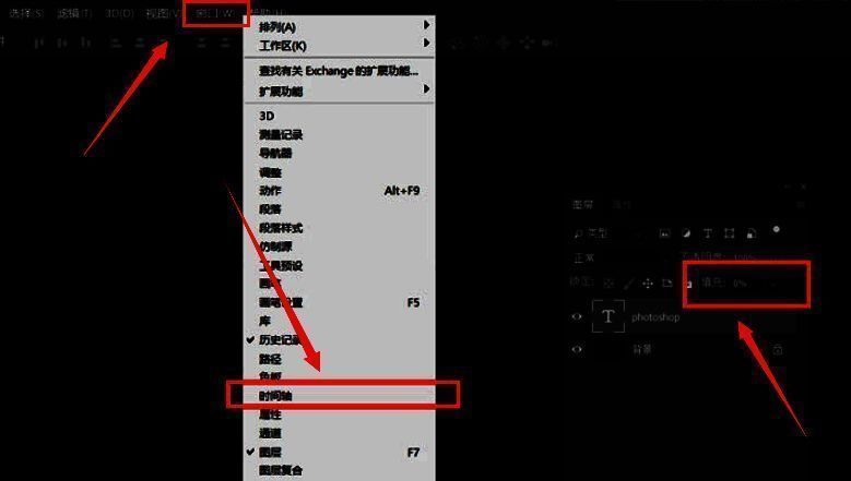 2.然后,将文字图层的填充设置为0,点击窗口菜单并创建时间轴