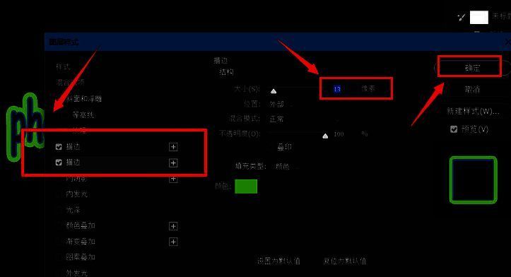 5.分别为文字设置3像素的内部蓝色描边以及13像素的外部绿色描边,点击确定保存并在时间轴样式处添加对应标记点