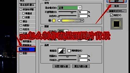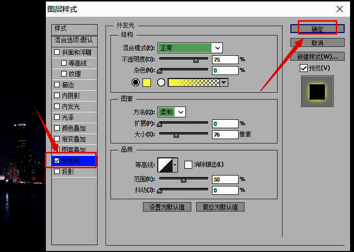 6.最后,鼠标双击图层,勾选外发光效果,如下图所示修改参数后,点击确定保存即可