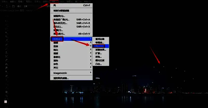 3.接着,鼠标点击选中圆点,在滤镜菜单的风格化栏目中,打开风选项