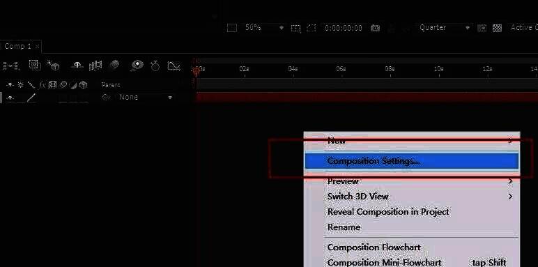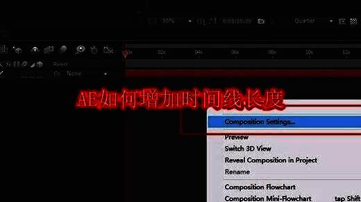 AE的时间线长度是能通过参数的调整来加长的,调出参数窗口有两种快捷的方式,首次就是在时间线下方的空白处点击右键,选择第二项“合成设置”