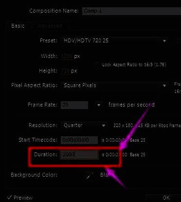 在下边的持续时间参数里面,就是目前的时间线时长,我们可以修改成我们想要的长度,比如25秒,就填写2500,以此类推。