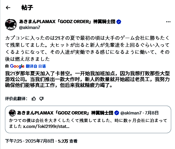 这种长期超负荷的工作节奏最终也让他身心俱疲。在后续的X贴文中,安田朗提到:“我21岁那年夏天加入卡普空,一开始是为了打败其他大厂而加班。随着每一款热门游戏的推出,公司里新人越来越多,数量超过了老员工,我也努力工作,帮助他们快速成长……之后,我就燃尽了。”