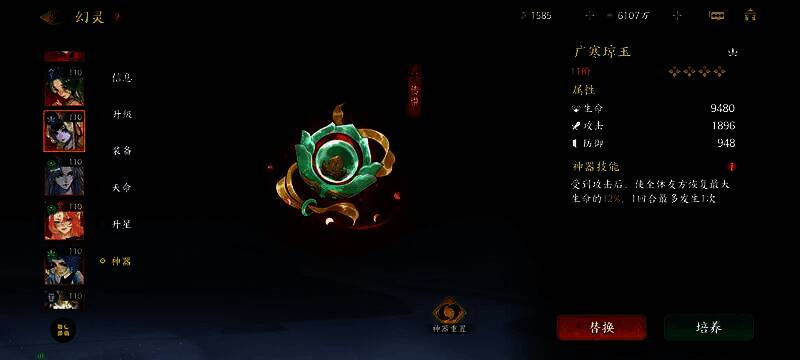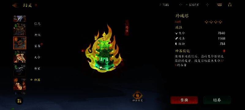 装备推荐无论前中后期都是速度套➕暴击套或者速度➕命中,主词条速度鞋 暴击或者攻击玉佩 攻击戒指或者命中戒指都可以,主要是看自身副词条缺什么属性来安排, 副词条推荐速度>效果命中>暴击=攻击 神器推荐天丝灵纱,最适合的群伤神器,平民玩家的不二之选,抽就完事了