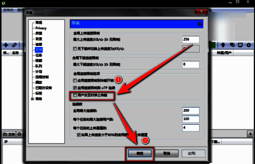 3.最后,找到全局速度限制选项栏目下的用户交互时停止传输按钮,鼠标点击进行勾选保存即可