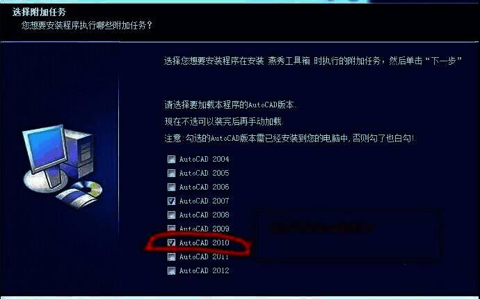 1.小编以cad2010版本为例,首先确定在安装燕秀工具箱时有勾选cad2010版本,如图