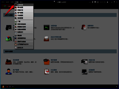 接下来,准备开始添加设备,按照下图中红色箭头指示位置点击 工具->设备管理,如下图: