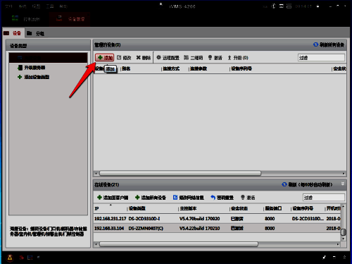 然后会打开设备管理的界面,在这个页面我们按照下图中红色箭头指示位置点击 添加,如下图: