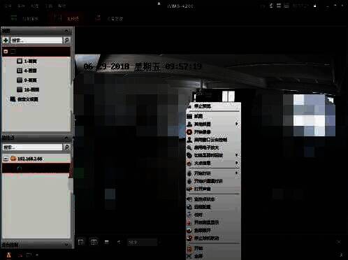 在4画面的时候,我们双击画面就可以进入到画面放大的界面,如下图所示,然后我们可以在画面中间右键,在弹出的右键菜单中我们可以进行一些更加详细的操作,包括 抓图、录像、对讲、校时等功能,当然这些功能都是需要视频设备的硬件支持才可以的,如下图: