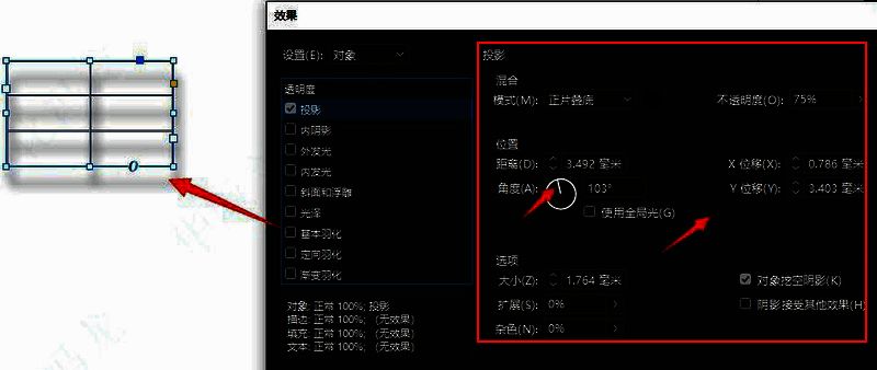 4.最后,如下图所示适当调整投影栏目下的参数信息,得出表格阴影图形即可