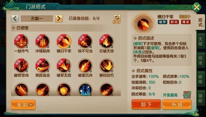 流派招式:冲锋陷阵、锐不可当、横扫千军、破釜沉舟