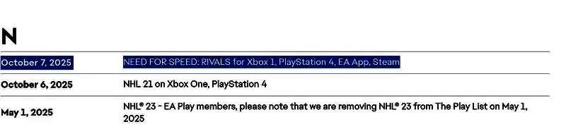 EA在其官网上已将《极品飞车18:宿敌》列入即将下架的游戏名单,平台包括Xbox One,PS4,EA App和Steam。该游戏的在线服务器将于2025年10月7日关闭。《极品飞车18:宿敌》外,《NHL21》(Xbox One|PS4)将于10月6日下架。