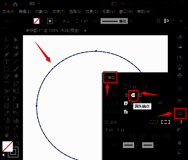 2.选中图形,在页面右侧打开描边面板,将端点修改为圆头端点