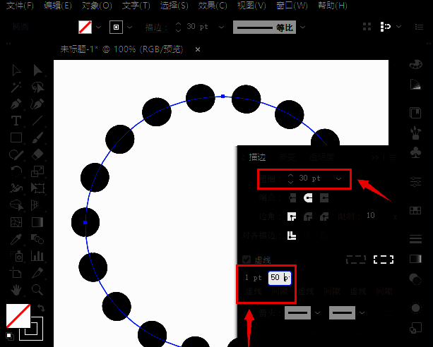 3.可以看到虚线已经变成了圆点,最后将描边粗细修改为30pt,虚线1pt,间隙50pt即可