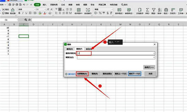第三步:在【查找内容】中输入“-*”,【替换】中不输入内容。点击【全部替换】。如下图所示: