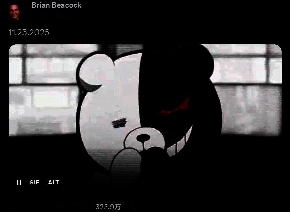 经典日系推理逃杀系列名作《弹丸论破》的主演之一、黑白熊英语演员Brian Beacock日前突然发声,直接展示了11月25日这个日期,暗示或有新作,敬请期待后续消息。