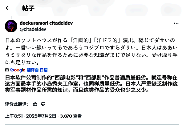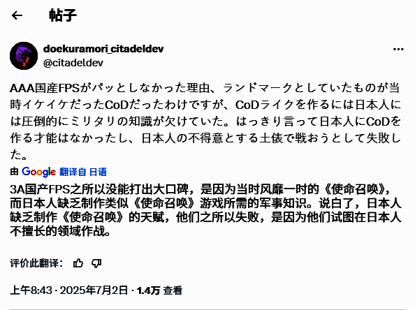 他在贴文中写道:“日本开发者本身以及其主要玩家群体,缺乏对于军事背景与历史的深入理解,试图复制《使命召唤》的‘酷感’和氛围,反而让游戏显得空洞。”