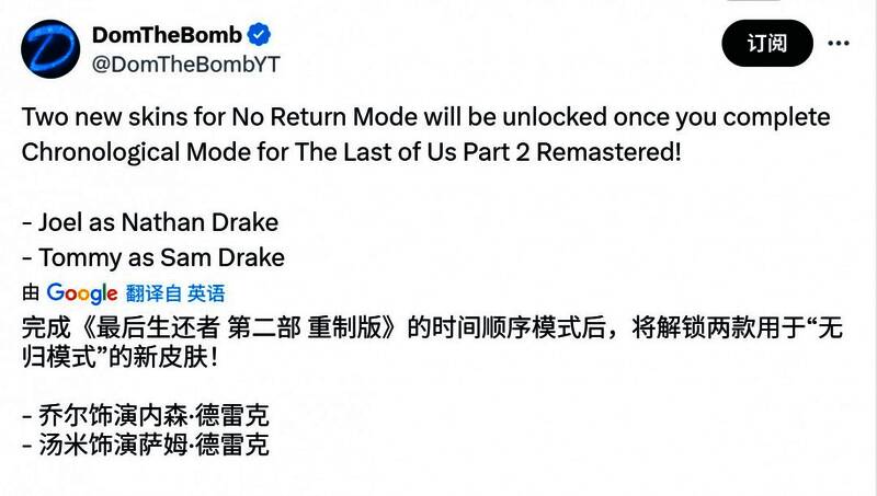 本次更新还为游戏的“无可挽回”模式添加了两款新皮肤,乔尔将扮演内森·德雷克,汤米将扮演山姆·德雷克。这些皮肤是顽皮狗为期一年的40周年庆典的一部分。