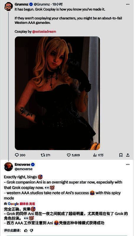 马斯克推出的AI女友Ani不仅在技术圈引发热议,还迅速蔓延到二次元和Cosplay圈层,成为一种全新的文化现象。推主Grummz的评价虽然略显辛辣,但却道出了一个现实问题:当今不少欧美3A游戏,尽管预算动辄上亿、技术规格一流,却在文化影响力和角色塑造方面频频失手,导致玩家既不愿二创,更不愿代入。