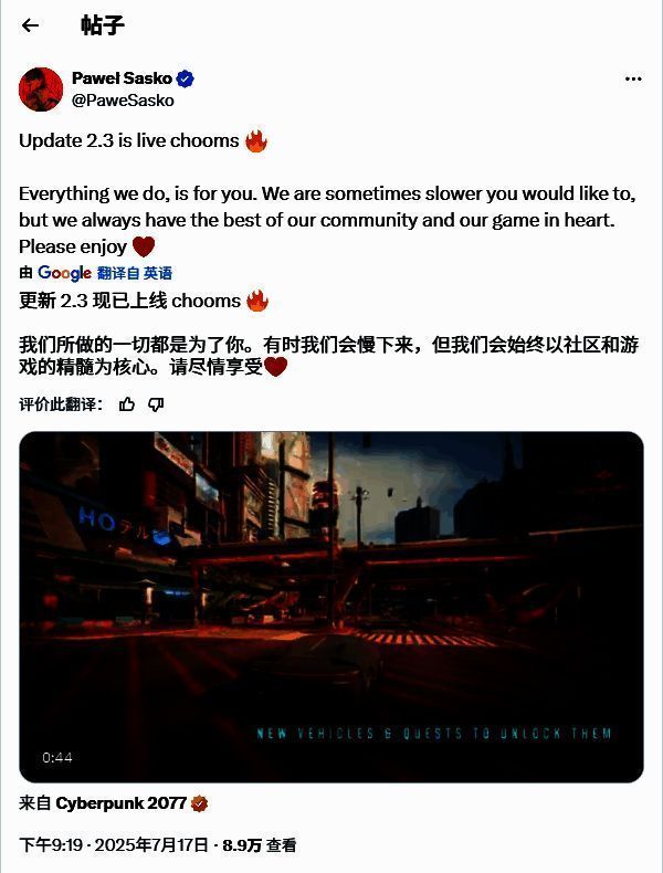 CDPR任务设计总监Paweł Sasko在补丁上线后通过社交媒体向玩家发表简短致辞,表示团队虽然“有时进度不如玩家期望快速”,但“一切为了玩家,始终心怀社区与游戏”,并鼓励玩家“享受更新内容”。