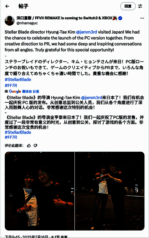近日,《剑星》制作人金亨泰在社交媒体上发布消息,称其在访问日本期间,与《最终幻想7重生》导演滨口直树进行了会面,并展开了“深入且充满启发”的交流。此次互动引发了粉丝对两款游戏未来可能联动的猜测。
