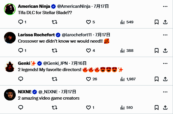 尽管双方均未透露具体合作计划,但社交平台上已有大量玩家表达了对《最终幻想7》角色与《剑星》联动的期待,尤以蒂法为焦点。有粉丝留言建议推出“蒂法DLC”,也有人希望看到正式的《最终幻想7x剑星》跨界合作。