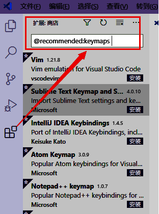 3.接着,在扩展商店的搜索栏页面中,输入@recommended:keymaps指令