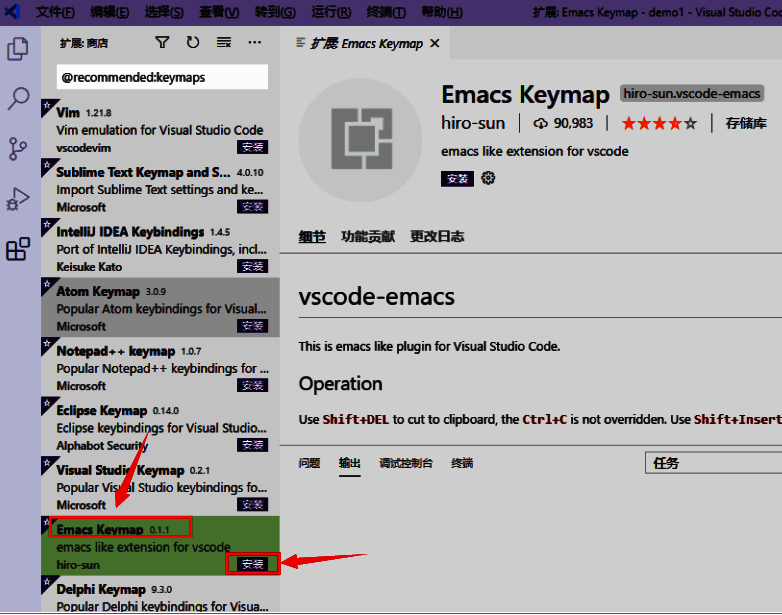 4.最后,找到Emacs Keymap快捷键,点击安装即可