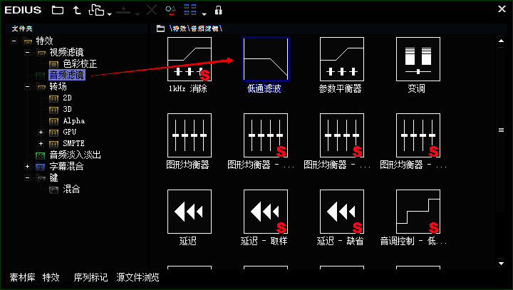 然后,打开特效面板,点击【音频滤镜】——【低通滤波】,并将该效果添加到视频素材中