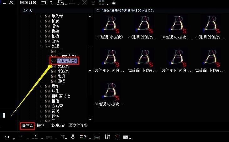 第一步,打开EDIUS软件界面后,先在素材库中导出3d小波浪特效