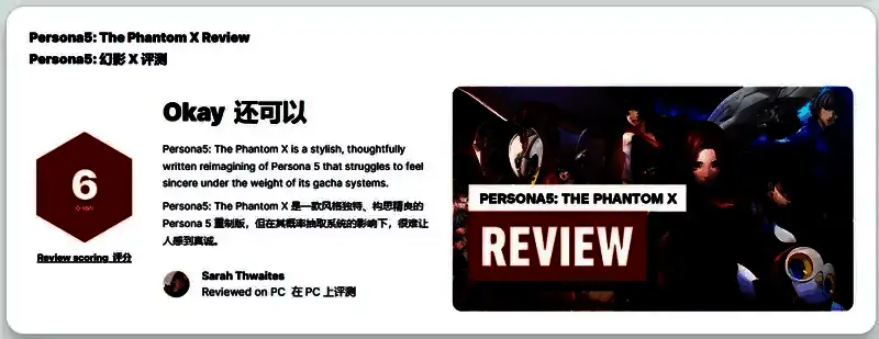 现IGN发布了对其的评测文章,并给出了6分的评价,表示:《女神异闻录:夜幕魅影》是一款风格鲜明、剧情精雕细琢的《P5》重构之作,却在抽卡机制的重压下难以维持真诚。