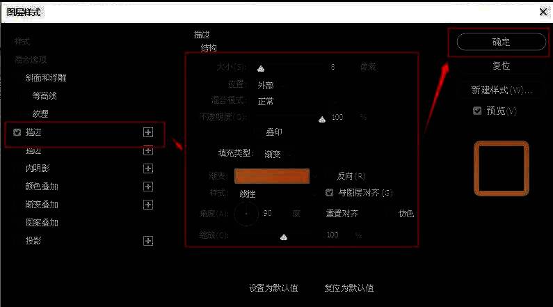 随后,在描边里面,把大小设置为【8】像素,填充设置为金色的渐变颜色,然后点击【确定】。