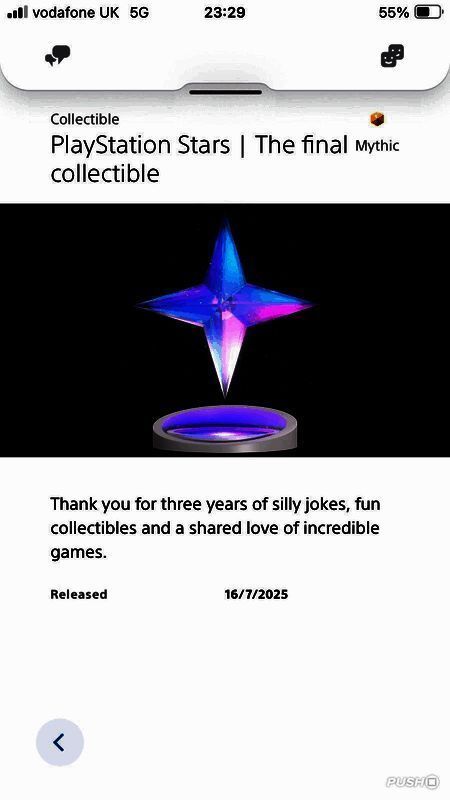 这款最终收藏品是一个实体化的“PlayStation 星星”,其描述文字写道:“PlayStation Stars 计划或许即将结束,但您的忠诚与支持将永远铭记于心。感谢这三年来共同度过的精彩游戏、有趣挑战和令人兴奋的数字收藏品!” 玩家只需游玩任意 PS5 或 PS4 游戏,即可将其收入囊中。