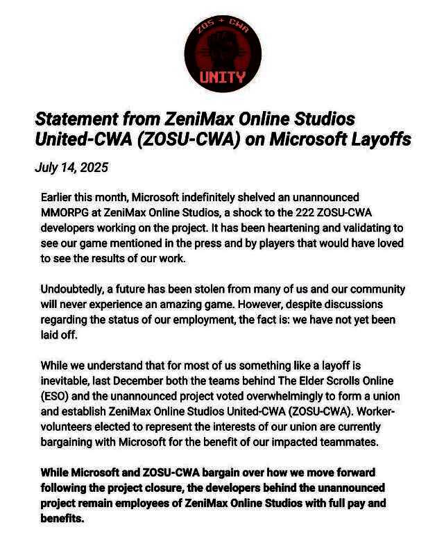 据说斯宾塞非常喜欢这款游戏,但这并没有挽救该项目。在这些事件发生后,ZeniMax在线工作室工会发表了一份官方声明,对其最新项目的失利表示遗憾。
