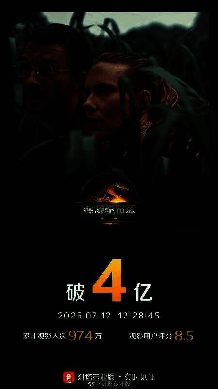 灯塔专业版实时数据显示,截至今日,影片《侏罗纪世界:重生》票房突破4亿,不仅如此,据猫眼专业版数据显示,本作已经强势登顶,获2025进口片票房冠军!