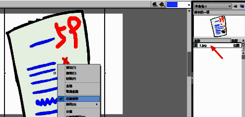 在右侧的库中,选中图片,并将图片拉进界面,并右击,选择“任意变形”,调整图片大小,并把图片置于图中右上角。