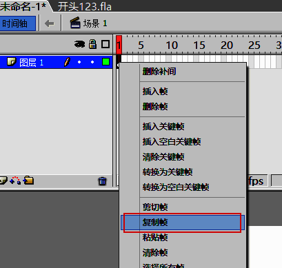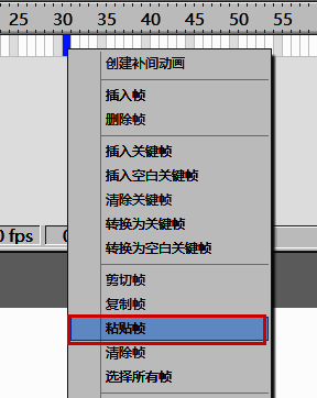 在时间轴上选中第一帧,右击“复制帧”。并在第30帧左右,右击,“黏贴帧”。