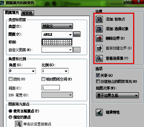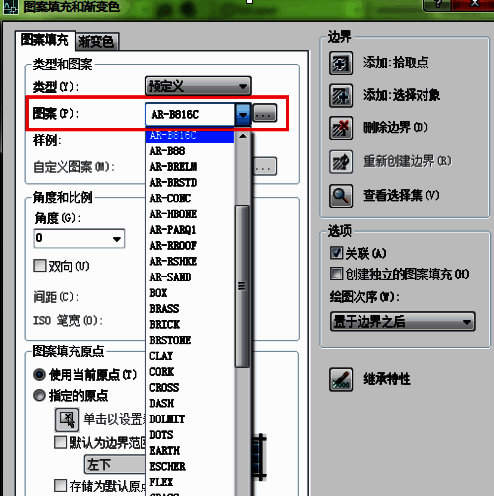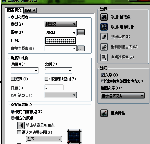 点击下拉菜单里的【图案填充】按钮,弹出图案填充和渐变色窗口,如下图所示。