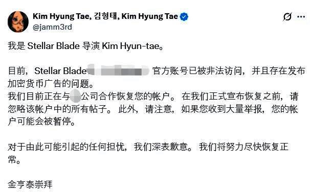 作为本作总监的金亨泰报告了官方账号遭到黑客入侵的情况。他表示,问题表现为账号发布了加密货币广告等内容。目前,公司正与平台密切合作,全力恢复账号。他再次强调,在官方正式宣布账号恢复之前,请无视该账号发布的所有内容。他还提醒,如果举报过于集中,账号可能会被平台暂停。