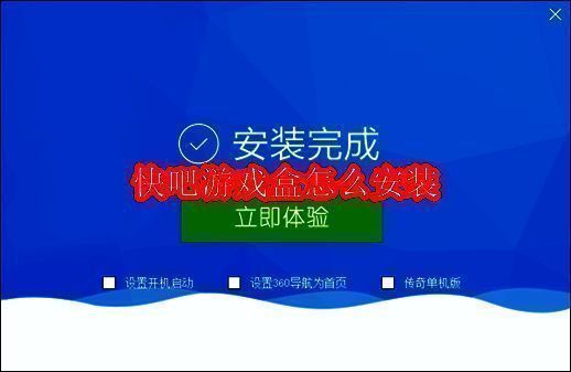 4.体验快吧游戏盒:一旦安装完成,系统会弹出提示。此时,你可以点击“立即体验”来启动快吧游戏盒。在安装完成后,你将看到几个选项,包括设置开机启动、将360导航设为首页以及下载传奇单机版。你可以根据个人需求选择是否执行这些操作。