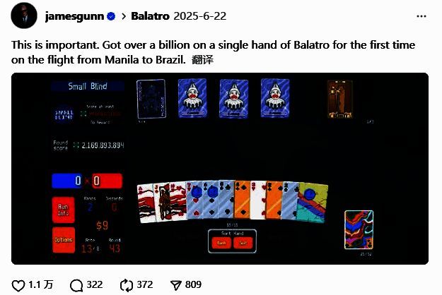 在接受采访期间,古恩还透露了自己在飞行途中创下的高分纪录。“我在从马尼拉飞往巴西的航班上,首次在《小丑牌》单局得分突破10亿,”他在社交媒体上分享了相关截图,显示其卓越表现。