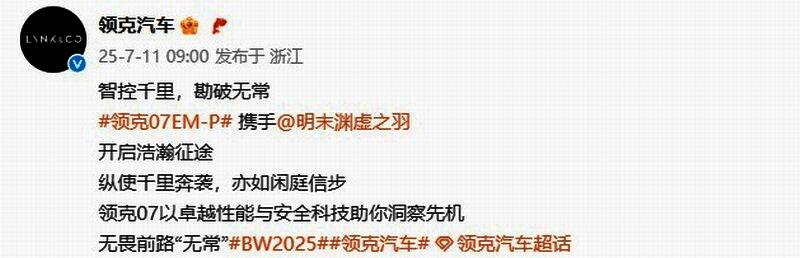 官方表示:“智控千里,勘破无常,领克07EM-P携手明末渊虚之羽开启浩瀚征途,纵使千里奔袭,亦如闲庭信步,领克07以卓越性能与安全科技助你洞察先机,无畏前路‘无常’。”
