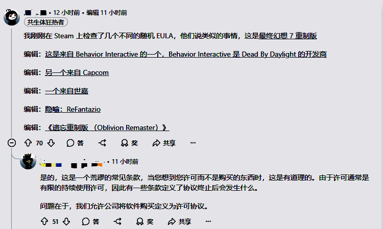 实际上,这条“终止后销毁副本”的条款早已存在于育碧的EULA中,且同样内容也广泛存在于许多其他厂商的协议里。例如Reddit用户Amon274指出,《最终幻想7重制版》《暗喻幻想》《上古卷轴:湮灭 重制版》等多款Steam游戏的用户协议中也有类似条款。一位《恐鬼症》的开发者更透露,该游戏早在两年前被人批评时就曾因类似条款而受到质疑。