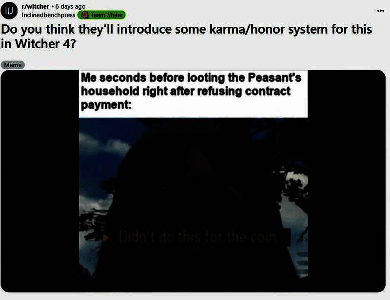 “你们觉得《巫师4》会引入某种业力/荣誉系统吗?” 红迪用户 Inclinedbenchpress 问道,截至发稿时该帖已获得超过 2000个赞。