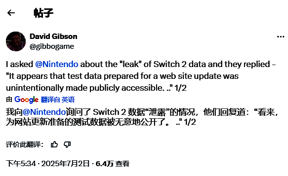 据泄露信息显示,6月5日刚发售的Switch 2主机销量达500万台。任天堂在声明中解释:"这些数据仅为网站更新测试所用,属于临时可见的测试内容。"