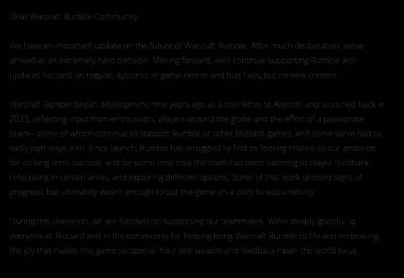 暴雪在声明中写道:"《魔兽大作战》始于九年前,作为一封献给艾泽拉斯的情书而启动开发,并于2023年上线,凝聚了全球热情玩家的反馈以及一支充满激情的团队的努力——其中一些人仍在支持《魔兽大作战》或其他暴雪游戏,而另一些我们则不得不遗憾地告别。"