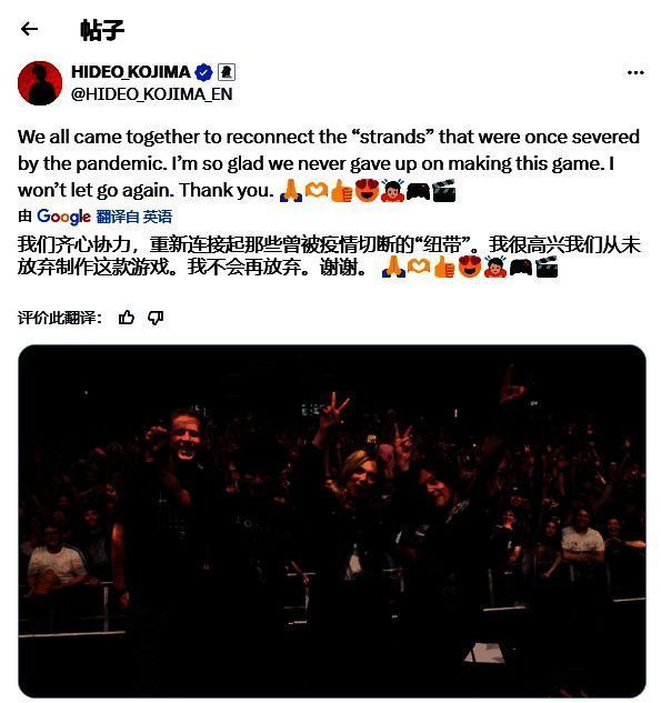 上周游戏正式发售时,小岛秀夫曾提到"在疫情期间,我真的有几次觉得我们可能永远无法完成这款游戏",并补充说"能够走到今天这一步真是令人感慨万千"。在昨天参加完伦敦"死亡搁浅世界巡演2"活动后,他在推特上真情流露,表达了这次活动以及这款游戏对他的重要意义。