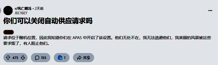 作为系列标志性的社交元素,《死亡搁浅2》中玩家通过标志牌、捐赠物资和转交货物相互影响的机制本应更具魅力。但新增的"自动补给请求"功能却引发了社区强烈不满,Reddit用户Jec1027的吐槽帖获得大量玩家共鸣——这项由APAS增强系统自动发起的物资求助,正以洪水之势淹没游戏地图。